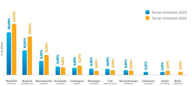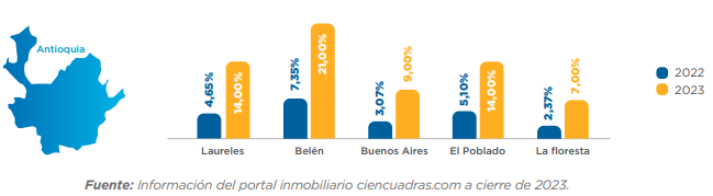 Este aumento, según Torres, ha jalonado los precios en ciudades y municipios aledaños a Medellín, como lo son Envigado, Rionegro y Sabaneta, que en el 2022 y 2023 vienen ocupando el top 10 de ciudades con mayor oferta del país, lo que ha generado que en general los precios en Antioquia para las viviendas en arriendo estén aumentando.