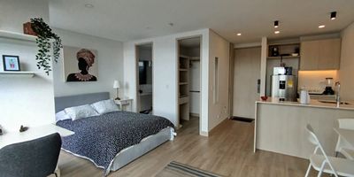 Apartaestudio Amoblado en Arriendo Corferias, Teusaquillo (Bogota) Vive con estilo y comodidad en este moderno apartaestudio para estrenar, ubicado en un noveno piso, lo que garantiza excelente iluminacion natural, ventilacion y una vista despejada. El inmueble cuenta con amoblado de alta calidad, diseno funcional con espacios separados y una distribucion pensada para brindar tranquilidad y confort. Ideal para quienes buscan independencia y un lugar acogedor para vivir. Esta ubicado en Corferias, una zona estrategica de Bogota, muy cerca de la Carrera 30 y la Avenida El Dorado, con facil acceso a transporte publico, universidades, centros medicos, zonas culturales y comerciales. Un espacio nuevo, tranquilo y fantastico para vivir! Agenda tu visita y conocelo.