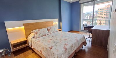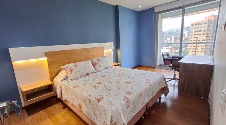 Apartaestudio, 1 habitación con escritorio, 2 baños, cocina, sala, TOTALMENTE AMOBLADO, cama doble, lavadora, nevera, barra, horno, balcón, área 54mts2, estrato 6, parqueadero, sin cuarto útil, piso 10, administración incluida, NO incluye servicios públicos, acceso a zonas comunes. Contrato mínimo 12 meses. Vista panorámica, Excelente ubicación, cerca al Centro Comercial el Tesoro, a la Notaria 24, Iglesia, Éxito, Farmacia Pasteur.