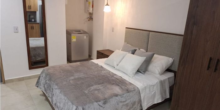 Área 20m2, 1 alcoba, closet, 1 baño, cocina integral, red de gas, zona de ropas, sala y comedor. Estrato 4, piso 1 con ascensor, gimnasio,jacuzzi, terraza y portería 24/7. Cerca a la av 80, glorieta de santa gema, Parque La Matea y excelentes rutas de transporte.