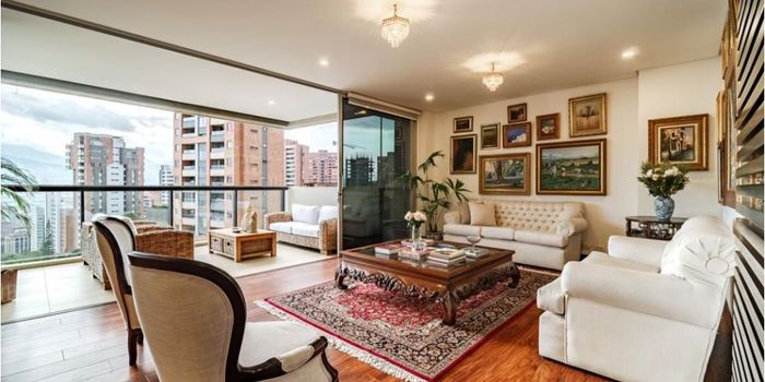 Apartamento Amoblado con excelente vista a la ciudad, en unidad completa y muy central. Área 268 metros, 3 habitaciones cada una con baño y vestier, servicio, baño social, closet de linos, biblioteca, balcón muy amplio que se une con la cocina, 2 parqueaderos paralelos, 3 cuartos útiles.