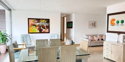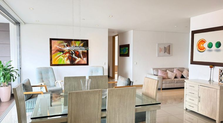Apartamento AMOBLADO en arriendo en unidad cerrada ubicada en sector residencial, tranquilo, de poco flujo vehicular, con conexión a rutas de transporte púbico, cerca a hoteles, restaurantes, centros comerciales, de fácil acceso a las avenidas principales y gran variedad de servicios complementarios de la zona. Cuenta con piso en porcelanato y madera, puerta de seguridad, sala comedor, estudio, estar de tv, 3 alcobas con vestier, baño en cada alcoba, baño social, con un total de 4 baños, cocina integral abierta tipo americano, alcoba y baño de servicio, zona de ropas, balcón y parqueaderos lineales cubiertos. Conjunto cerrado con ascensores, piscina, gimnasio, salón social, parques infantiles, cancha de squash, zonas verdes, vigilancia y portería 24 horas, citófono y circuito cerrado de TV. Inmuebles sujetos a verificación de disponibilidad.
