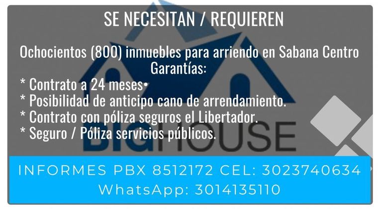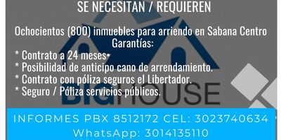 Se NECESITAN / REQUIEREN ochocientos (800) inmuebles para arriendo en Sabana Centro Garantías Contrato a 24 meses Posibilidad anticipo canon de arrendamiento Contrato con póliza seguros el libertador. Seguro / Póliza servicios públicos.