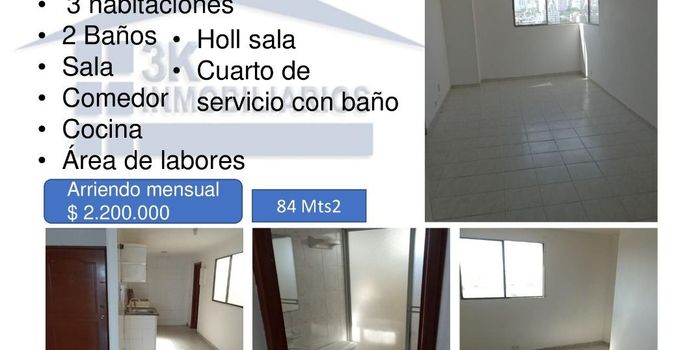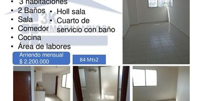 Apartamento en Arriendo Cuenta con 3 habitaciones , 2 bañoS , sala , comedor , cocina ,area de labores , holl sala , cuarto de servicio con baño Tiene un area de 84 Mts2