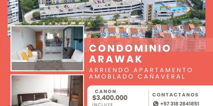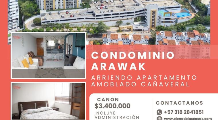Apartamento amoblado en arriendo | Cañaveral, Floridablanca Ubicado en el Condominio Arawak, este apartamento ofrece comodidad, amplitud y una excelente distribución en uno de los sectores más valorizados de la zona. Dirección: Calle 157 #154-137 Área residencial en Cañaveral Piso alto Canon: $3.400.000 Incluye administración y servicio de wifi No incluye servicios públicos Características: 3 habitaciones 2 baños Sala comedor amplia Balcón Cocina integral con barra americana Espacio de estudio ideal para home office Parqueadero descubierto El conjunto cuenta con vigilancia 24/7, piscina, gimnasio, zona infantil y parqueadero para visitantes.