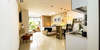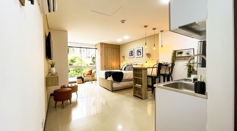 Apartaestudio amoblado en arriendo cerca a Av. principal, restaurantes, parques, supermercados, facil acceso a transporte publico y una gran variedad de servicios complementarios. Piso en baldosa, 1 alcoba, baño, cocina integral abierta tipo americano y parqueadero cubierto. Cuenta con aire acondicionado. Conjunto cerrado con ascensor, gimnasio, turco, vigilancia 24 hrs, y circuito cerrado de tv. Inmuebles sujetos a verificación de disponibilidad.