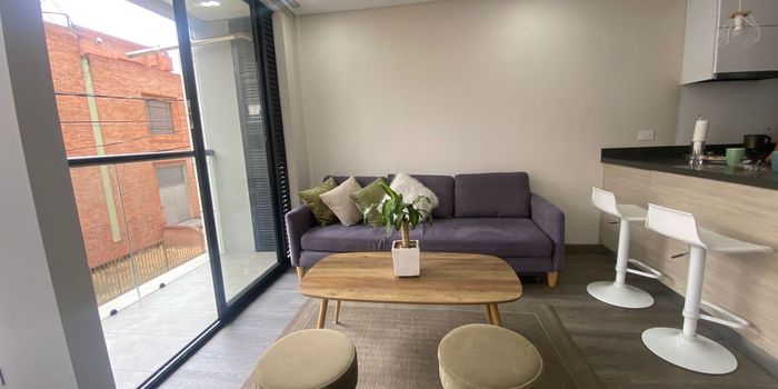 Apartamento en el barrio Lisboa, de una habitación, 2 baños, sala comedor en un solo ambiente con balcón, vista interior, cocina abierta con barra, habitación principal con baño privado y vestier, el precio incluye la administración