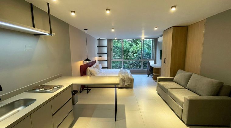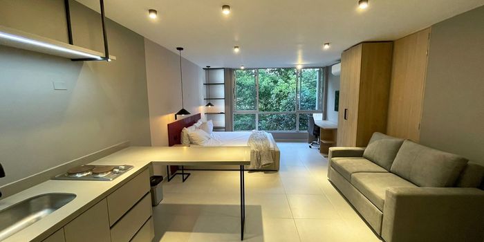 Apartaestudio amobladao en arriendo en unidad cerrada, cerca a parques principales, centros comerciales, rutas de transporte y servicios complementarios. Piso en ceramica, puerta de seguridad, 1 alcoba, baño, cocina integral abierta tipo americano y zona de ropas. Edificio sin ascensor, zonas verdes, vigilancia 12 hrs, y citofonia. *Inmuebles sujetos a verificación de disponibilidad.*