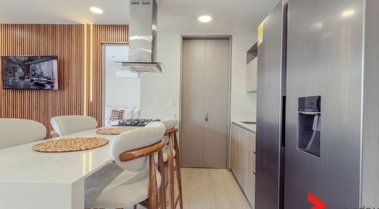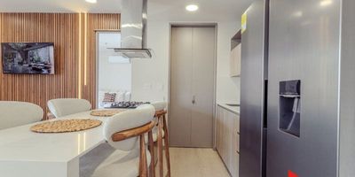 COD 7734 Apartamento amoblado en Poblado Patio Bonito, consta de 70 metros, 1 alcoba, 2 baños, 2 Vestier, cocina integral, sala comedor, balcón, parqueadero sencillo, portería, ascensor, piscina, restaurante. Cerca a supermercados, parques, transporte público.