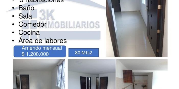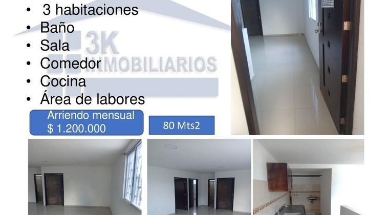 Apartamento cuenta con 3 habitaciones , 1 baño , sala comedor , cocina , area de labores , tiene un area de 80 Mts2 y un valor de arriendo mensual de $1.200.000