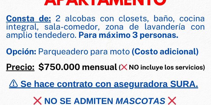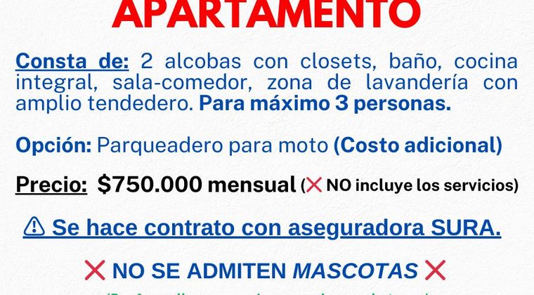 Se Arrienda Apartamento en Fusagasugá. Valor: $750.000 mensual Consta de: 2 alcobas con closet, sala comedor, cocina integral, baño y patio interno con amplio tendedero. Es en un tercer piso, las escaleras son amplias y cómodas. Tiene servicios de agua, luz y gas. Garaje para moto por un costo adicional. Contrato mínimo a 6 meses con aseguradora SURA. No se permiten animalitos porque aumenta muchísimo el precio del seguro. Nota: Solo se hace contrato de arrendamiento con SURA, es requisito contar con ingresos estables y no tener reportes negativos en datacrédito.