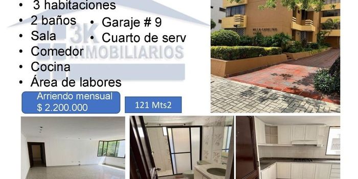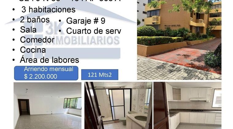 Apartamento en Arriendo o venta Cuenta con 3 habitaciones , 2 baños , sala , comedor , cocina , area de labores ,cuarto de serv con baño ,garaje 9 , Tiene un area de 121 Mts2