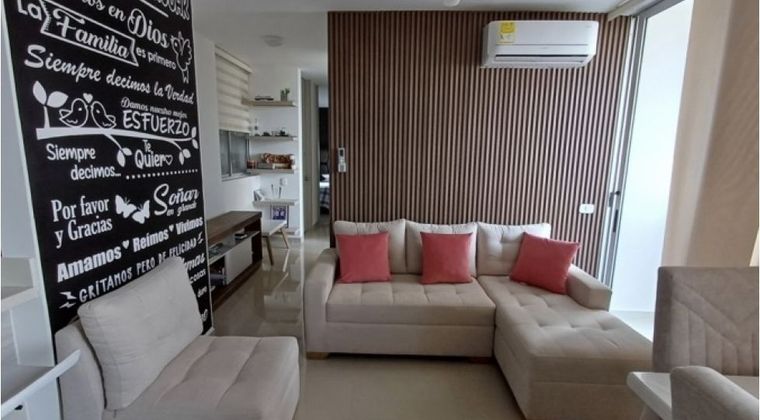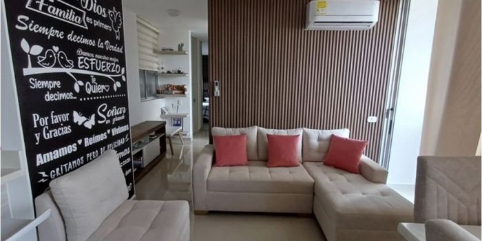 Código 942FR8652 Hermoso apartamento cuenta con tres habitaciones y dos baños, la habitación principal con baño propio y un vestier. Cada habitacion cuenta con su closet. Amplia sala y comedor con cocina integral, mesón en mármol y campana extractora, zona de ropas y su balcón con increibles vistas a la ciudad, por un lado el cerro de la Popa y por otro la zona portuaria, gran ubicacion de fácil acceso a vias principales. En un conjunto cerrado con vigilancia veinticuatro horas. Exteriormente el conjunto cuenta con dos piscinas, salón social, parque infantil, sauna, gimnasio, guardería, zona de juegos, parqueadero para visitantes y propio, zona BBQ. El apartamento se vende amoblado si asi lo quisiera con electrodomesticos, televisores y aires acondicionados nuevos de alta gama ademas de sus cortinas japonesas.