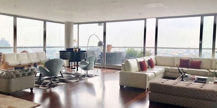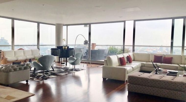 Area 550 mts mas 300 mts de terraza, vendo apartamento duplex, vista hacia el oriente y occidente, entrada de luz y sol, sala comedor, con una excelente distribucion, ascensor que llega a los dos pisos, balcon, estudio, estar de alcobas, cuatro habitaciones cada una con su baño, cocina independiente, amplia muy iluminada con ventilacion natural, zona de lavanderia independiente, cuarto y baño de servicio, seis parqueaderos independientes, un deposito, el edificio tiene gimnasio, dos salas de reuniones, cuarto de conductores, parqueaderos de visitantes, cuatro elevadores, apts - c- dos