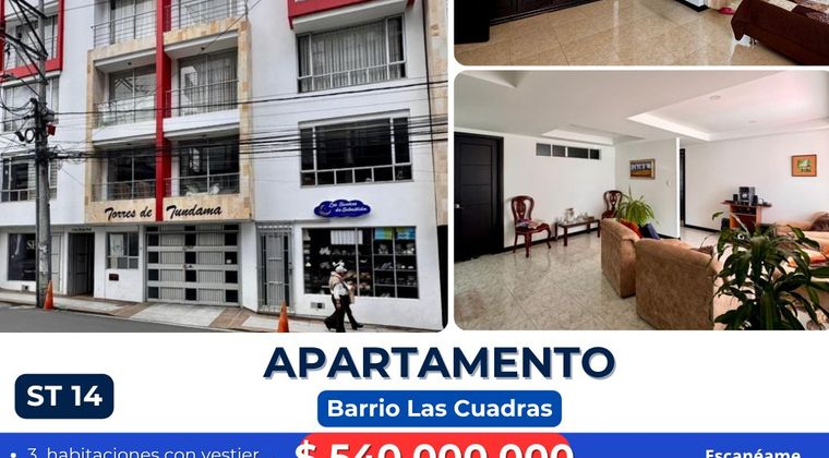 Apartamento en Venta – Barrio Las Cuadras Características del inmueble: * 3 habitaciones, todas con vestier * Sala – comedor amplia * Cocina integral * Apartamento interno (mayor tranquilidad) * Zona de lavandería privada en terraza Adicionales: * Parqueadero privado y exclusivo * Vigilancia 24 horas ( valor$ 300.000) * Edificio con ascensor Información legal: * Sin deudas ¡Una excelente oportunidad para inversión o vivienda!