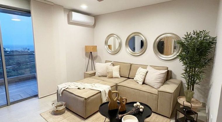 Apartamento de 68.58 m2, consta de sala, comedor, amplios balcones con vista al mar, cocina abierta integral, área de labores, una alcoba, dos baños, parqueadero cubierto. Edificio con todas las amenidades.