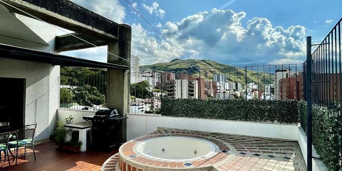Se vende Penthouse Duplex al oeste de la ciudad de Cali, barrio Santa Teresita, 266 m² de área construida, dos terrazas que suman 70 m² adicionales, 1re piso con Sala, comedor, cocina integral con cuarto de servicio y baño, baño social, 2 habitaciones, baño de habitaciones, Sala de TV y estudio. 2do piso con estudio, sala de estar, terraza con Jacuzzy, zona BBQ, cuarto principal con baño, dos vestier y terraza. El apartamento tiene espectacular vista, amplios espacios, excelente distribución y 3 garajes. El edificio cuenta con salón social, piscina, baño turco, sauna, área de juegos, dos ascensores y vigilancia 24/7. Valor venta $1.400.000.000 valor administración $1.700.000