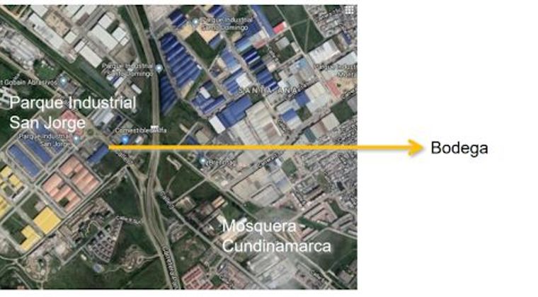 Bodega ubicada en Parque industrial San Jorge, con edificio de 3 pisos para oficinas, bodega con diecisiete metros de altura tipo hangar, dos locales con un área cada uno de setecientos metros cuadrados, ocho parqueaderos propios, ocho parqueaderos comunes, área para seis tractomulas, catorce camiones, Subestación propia de 150 kVA y planta eléctrica de cuarenta kVA. Cuenta con tanques para almacenamiento para productos a granel, tanques para aguas residuales y agua potable.