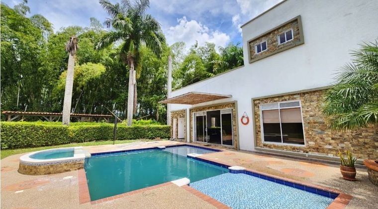 Se arrienda casa campestre semi-amoblada, en conjunto cerrado, la casa de dos niveles consta de 4 alcobas cada una con su baño privado, la principal con vestier y terraza, habitacion de servicio con baño, sala comedor, estudio, cocina, zona de ropa, baño social, zona de juegos, hall de alcoba con terraza, piscina, jacuzzi, baño exterior, parqueadero descubierto para 3 vehiculos. Vigilancia 24/7, cerca a La Tebaida donde encuentras supermerados, bancos, droguerias, restautantes y comercio, cerca al club campestre de Armenia y al Aeropuerto Internacional El Eden. El precio ya incluye el mantenimiento de prados cada 45 dias y de piscina.
