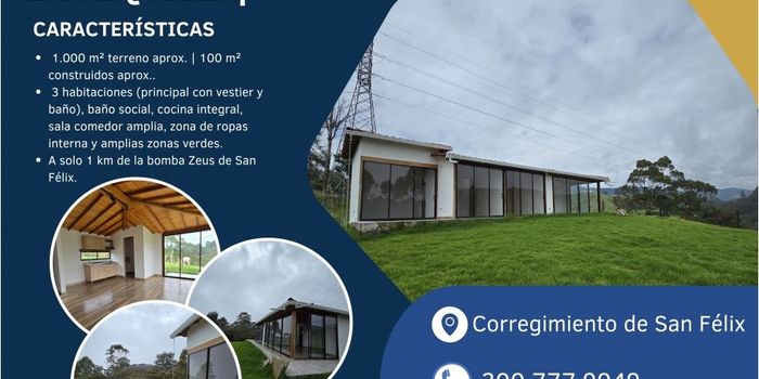 ? Alquiler de Casa Finca en el Sector Manantiales – Corregimiento San Félix, Bello (Antioquia) Si buscas tranquilidad, naturaleza y un espacio ideal para vivir rodeado de aire puro, esta hermosa casa finca es perfecta para ti. Ubicada en el sector Manantiales, a solo 1 km de la bomba Zeus de San Félix, ofrece una combinación ideal entre comodidad y entorno campestre. ✨ Características principales: Área total del terreno: 1.000 m² aprox. Área construida: 100 m² aprox. 3 habitaciones, dos con clóset y la principal con vestier y baño privado. Baño social adicional. Sala comedor amplia con excelente iluminación natural. Cocina integral moderna y funcional. Zona de ropas interna. Todas las habitaciones cuentan con ventanales hacia el exterior que permiten disfrutar de la vista y la brisa natural. Amplias zonas verdes para el descanso, recreación o proyectos de jardinería. ? Acceso y ubicación: A solo 1 kilómetro desde la bomba Zeus de San Félix, con vías en excelente estado. Sector tranquilo, con ambiente natural y vista panorámica. ? Canon de arrendamiento: $2.800.000 mensuales ? Vive la experiencia de un entorno campestre con todas las comodidades de la ciudad cerca. ? Continente Inmobiliario Tú lo sueñas, nosotros lo encontramos. ? **********