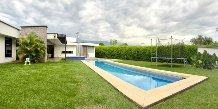 Esta casa cuenta con una alcoba principal muy amplia, con closet, y baño con doble lavamanos, ducha y tina, dos alcobas gemelas que comparten un baño amplio, y una tercera alcoba ubicada en un espacio más independiente con baño social completo. Y cuenta también con una sala de televisión, Todas las alcobas tienen vista al jardín. Una sala comedor amplia seguida de la cocina abierta y con isla estilo americano y tiene ventanales inmensos que conectan la casa con el jardín y una terraza espectacular con piscina y el jacuzzi, como siempre lo imaginaste. Esta zona de espacios húmedos tambien cuenta con baño y ducha. Y alcoba del servicio con baño, la zona de ropas esta ubicada estrategicamente en una zona que tus invitados no notarán. 4 alcobas Sala de TV 3 baños completos alcoba de servicio con baño Sala comedor Cocina integral Sala exterior o terraza con baño y ducha. Zona de ropas Piscina y jacuzzi Parqueadero hasta para 6 carros