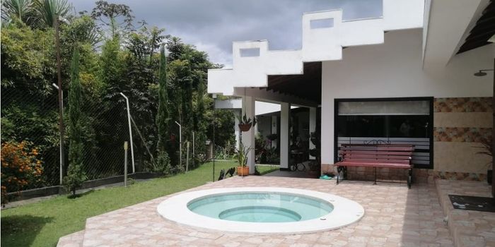SE VENDE ESPECTACUALR CASA CAMPESTRE En conjunto ubicado a menos de cinco minutos del norte por la via Armenia - Circasia. Consta de área lote: 1000m2, área construida: 514m2, cuatro habitaciones, cuatro baños, sala -comedor amplia, sala de television, tiene un estudio independiente estilo biblioteca, cocina integral, patio de ropas amplio y con muy buena iluminación, cuenta con parqueadero privado para dos o cuatro carros, jacuzzi, zona bbq, cuarto de servicios, jardín y hermosos espacios bien distribuidos con muy buenos acabados. El conjunto cuenta con vigilancia privada las 24 horas y la casa tiene muy buena ubicación con fácil acceso a transporte publico, restaurantes y más.