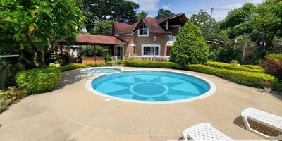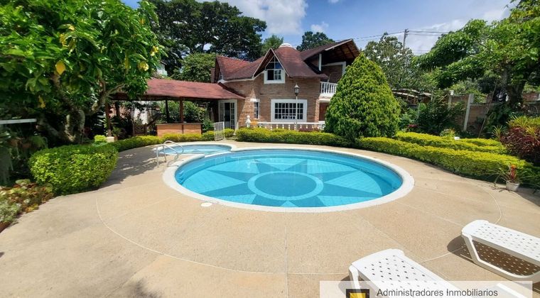 Vendo espectacular casa campestre frente a Catay, terreno plano de 840 m2 con garaje doble, jardines, senderos, flores, frutales, 260 m2 construidos en concepto circular, piscina con jacuzzi, kiosco, baño exterior completo, sauna, cuarto de máquinas con lavadero, estadero grande cubierto, acogedora casa de dos pisos con cuatro alcobas, aires acondicionados, tres baños uno privado y dos familiares, cocina integral, sala de recibo, comedor, hall amplio, estudio y balcón con vista a la naturaleza.
