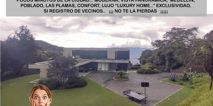 venta de espectacular casa campestre en medio de la ciudad y con 5.300 mt2 de lote Venta casa campestre poblado palmas vista panorámica elegancia exclusividad Vive hermosos momentos con familia y amigos en el amplio balcón con una increíble vista, disfruta lo maravilloso de la naturaleza desde cualquier lugar de esta casa a través de las paredes de ventanas que dejan al descubierto un entorno mágico y natural, pero conservando siempre tu privacidad. A solo 5 minutos del Centro Comercial El Tesoro se encuentra esta casa de arquitectura moderna y minimalista, ubicada en el mejor rincón de una de las más exclusivas y seguras unidades campestres de la ciudad de Medellín. Rodeada de árboles y naturaleza, en donde podrás disfrutar de su inmenso jardín Rodeada de árboles y naturaleza y lo mejor…. excelente vista a la ciudad . Rodeada de naturaleza, pero también con una vista espectacular de la ciudad, en condominio privado y a solo 10 minutos de las mejores tiendas, los mejores restaurantes, escuelas con alta calificación, entidades financieras y todo lo que necesitas. Esta impresionante propiedad con altos acabados se encuentra en la exclusiva zona residencial de Medellín Las Palmas en El Poblado. Cuenta con facilidades de acceso y transporte. Cerca de todos los servicios y en medio de la naturaleza. lujosa y cómoda casa de 2 niveles Cuenta con cuatro habitaciones con baño y Vestier, baño social y habitación de empleada completa. Parqueadero para 3 carros cubiertos y 5 descubiertos. Tiene un lote de 5.300 metros ,casi 1 cuadra…. en la ciudad de Medellín, y 600 metros cuadrados de construcción, con una espectacular vista que provoca envidia. Valor venta $ 9.500 nueve mil quinientos millones de pesos colombianos valor en dólares usd $ 2.260.000 dos millones doscientos sesenta mil dólares aprox. Para finalizar….. Si este es tu presupuesto , si te interesa esta propiedad y llena tus expectativas de inversión, No dejes pasar la oportunid