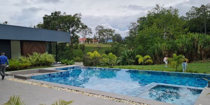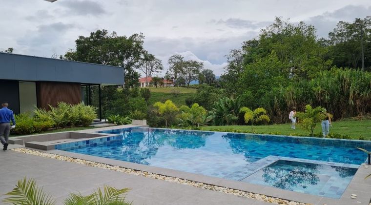 A la venta esta hermosa casa campestre para estrenar, en uno de los mejores sitios de cerritos en la ciudad de Pereira Risaralda, rodeado de naturaleza, una generosa área de 550 metros de casa y 200 metros de piscinas, al lado de un hermoso lago iluminado y lleno de vida silvestre, acabados de lujo, sala de cine, pisos en mármol, amplios parqueaderos, vigilancia 24/7, nacimiento de agua propio, y un lote totalmente plano de 3824 metros, lista para entregar.