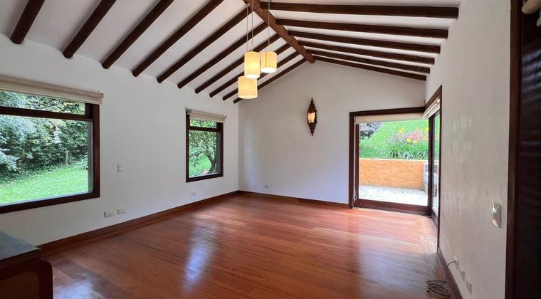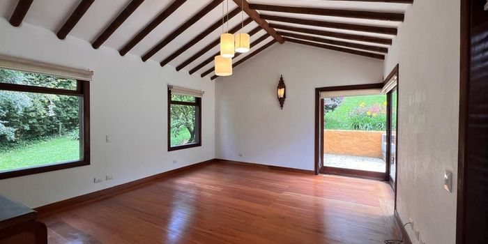 Casa en arriendo en unidad cerrada ubicada en un sector tranquilo, campestre, con poco flujo vehicular, con fácil acceso a vía principal y con conexión a gran variedad de servicios complementarios de la zona. Cuenta con un Lote de gran extension Aprox. 6,500M2, 2 niveles, piso en madera, chimenea, sala y comedor independientes, estudio, biblioteca, estar de tv, 4 alcobas con baño en cada una y vestier en la principal, baño social, cocina integral abierta tipo americano, alcoba y baño de servicio, zona de ropas, balcón, terraza, jardin y parqueaderos independientes cubiertos. Conjunto cerrado con excelentes zonas verdes, vigilancia y portería 24 horas, citofonia y circuito cerrado de tv.Inmuebles sujetos a verificación de disponibilidad