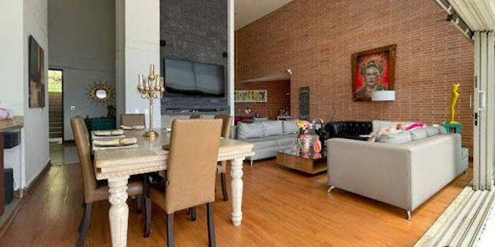Casa en arriendo en Caldas, con amplios y exclusivos espacios, ideal para quienes buscan comodidad y contacto con la naturaleza. La propiedad cuenta con 4 alcobas, 5 baños, parqueadero cubierto para 2 vehículos y adicional espacio para 6 carros, además de cuarto de herramientas y patio interior cubierto. La cocina tipo isla se integra con una altura interior de 7 metros, brindando amplitud y luminosidad. La casa dispone de deck con vista panorámica a Medellín, 11 pesebreras, picadero y bodega, lo que la convierte en una excelente opción tanto para uso residencial como recreativo. Además, incluye una fonda de 250 m² con vista a la parcelación, disponible también en arriendo y con opción de entregarse amoblada.
