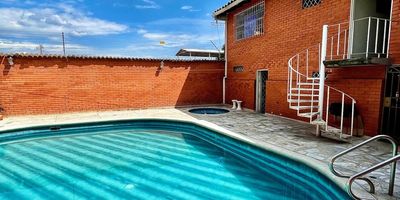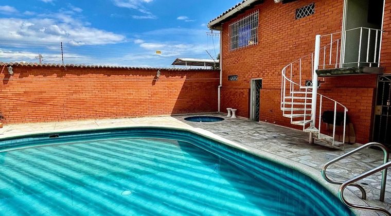 Se Alquila casa al Oeste de Cali, barrio Miraflores, 427m2, 4 habitaciones, 3 baños, sala de TV, estudio, sala, comedor, 2 patios internos, cocina integral con bahía, piscina, sauna, jacuzzi, cuarto de servicio con baño, garaje con puerta eléctrica para máximo 6 carros, cuarto de herramientas. Casa con amplios espacios, traga luz en la sala, techo en madera a doble altura, piso en retal de mármol, cerca eléctrica, circuito de cámaras, puerta blindada, cerraduras y cuarto de máquinas. Casa ubicada a 5 cuadras de la calle 5ta, sector residencial seguro, vigilancia en la zona, tiene cerca restaurantes, supermercados y avenidas principales. Valor alquiler $7.000.000