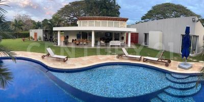 Se alquila linda y amplia Casa de 268 M2 en Condominio Forestal Club Lote 55 cuyo techo es a Doble altura, Ventanales con salida al jardín o a terraza auxiliar, en todos los espacios, 3 Habitaciones cada una con su walking clóset y baño, Una de ellas se integra con un estudio súper amplio con una gigante biblioteca, Baño social, Sala de TV, Sala comedor, Cocina abierta con lavadora de platos, nevera para vinos y (2) alacenas, Amplia zona de lavandería con espacio para lavadora y secadora, Terraza social de 65 mt2 con horno de leña, asador, caja china, Baño y ducha exterior y Cuarto del servicio con baño. La Casa tiene adicional una Casa de Visitas que consta de 100 mt2, Una habitación con aire acondicionado, Un baño, Una sala con puerta corrediza para convertir en cuarto adicional, cocina integral con terraza para comedor, estudio /oficina con aire acondicionado y terraza en el techo con vista a la piscina y al atardecer de Rozo, (2) depósitos, garaje cubierto para 2 vehículos, parqueadero para 6 vehículos adicionales, Páneles solares, Piscina y jacuzzi, Agenda tu Cita Ya!!!!