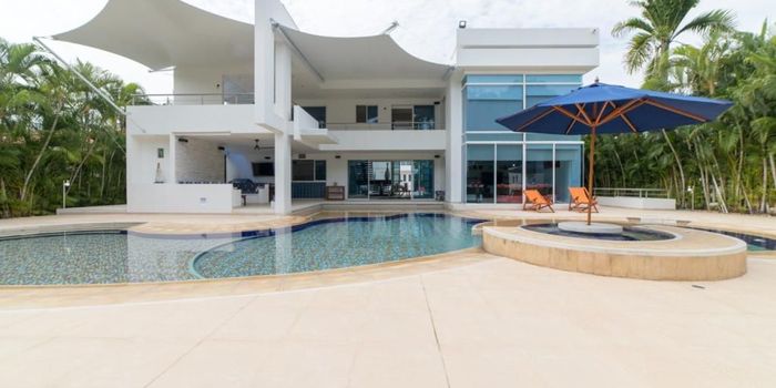 Espectacular casa con diseño ùnico ,sùper fresca, en EL PEÑON CONDOMINIO CAMPESTRE, con campo de golf de 18 hoyos,canchas deportivas,sede social, lagos.La casa es de dos niveles ,con lindos acabados, tiene 6 alcobas cada una con baño en sitio y buenos closets , la principal espaciosa con walkin closet, baño amplio y acceso a una gran terraza en el 2 nivel con parasol, estudio o star de television espacioso, con muebles y puerta,sala , family room y comedor en un lindo ambiente , amplio, con altura doble en primer nivel, puertas y ventanas piso techo ofreciendo frescura y amplitud, cocina amplia, abierta con excelentes electrodomésticos, muebles y servicio de cocina completo,zona de lavanderia amplia.El primer nivel tiene una hermosa piscina, con yacuzzy, playa, acomodada con parasoles , sillas y comedor auxiliar amplio para disfrutar en familia conectada a un gran patio verde rodeado de árboles que encierra la casa haciéndola totalmente independiente,cuarto de motores, depòsito.