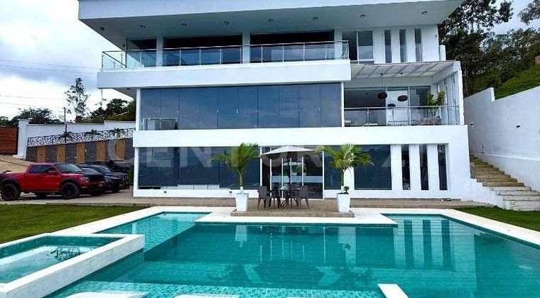 Entrada privada con portón eléctrico con Lote de 3.000 m², Área construida total: 1.450 m², Casa principal: 824 m² construidos, Año de construcción:2022. La propiedad cuenta con: 5 habitaciones (principal con baño, amplio Vestier y balcón ), Sala principal, Sala de TV, Cocina integral moderna con isla + comedor independiente, Estudio, zona de ropas Tercer piso: Zona de juegos, gimnasio, 2 baños, apartamento independiente Con cocina, 1 alcoba, y 1 baño, Piscina, jacuzzi con calentador , chorros e iluminación, Kiosco BBQ con cocina, TV, zona de fogata y baño,Cancha de fútbol, Juegos infantiles, Caballerizas para 2 ponis, Casa de mayordomos con dos habitaciones, Casa con cierre perimetral, puerta eléctrica, sistema de seguridad y domotizado, iluminación exterior con luces solares.