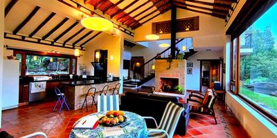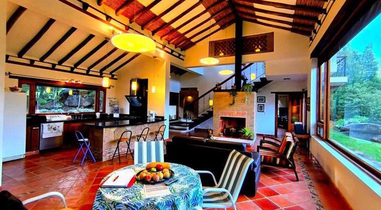 VENDO FAMILIAR Y CÁLIDA CASA. Villa de Leyva-Boyacá. En un terreno arborizado y caminable de tres mil trescientos sesenta y nueve mts2 se ubica está sólida y amplia casa de dos niveles. Diseño característico de la zona y construída con materiales de alta especificación y equipos de excelente calidad. Rodeada de verde, dispone de amplia zona social con chimenea , moderna y funcional , con ventanales piso-techo que permiten luz natural por todos sus lados . La cocina abierta a gas con mesón granito , completa dotación , área lavandería con alacenas, comedor auxiliar , terraza BBQ , y anexo exterior adicional una casita servicio con baño anexo. Cuatro habitaciones, dos con baño privado y dos comparten baño con sus closets , amplias,luminosas y cómodas. Habitación principal en el segundo nivel ,con baño privado, walk-in closet y un amplio balcón. La casa cuenta con depósito de reserva de agua. Zona de positiva valorización, servicios públicos en funcionamiento ,transporte público y vias de acceso. Equidistante a la plaza principal de Villa de Leyva y zonas de interés turistico .