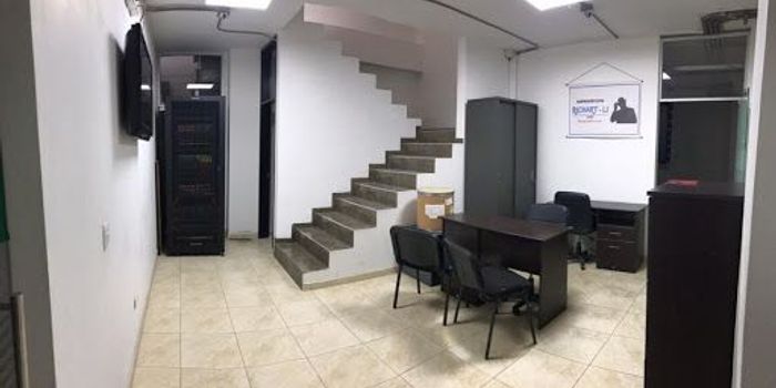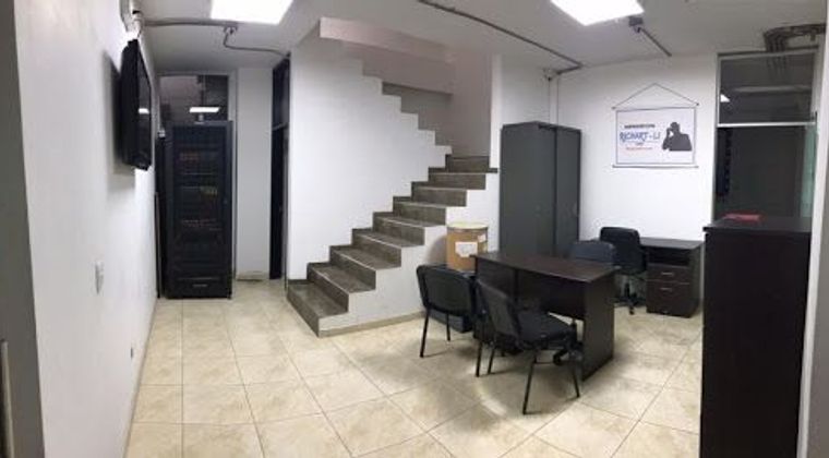 Edificio de cuatro pisos mas altillo, bodega interior con estantería, parqueadero para tres vehículos, puerta eléctrica, y puerta de acceso principal con apertura remota.
