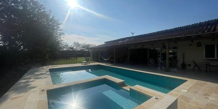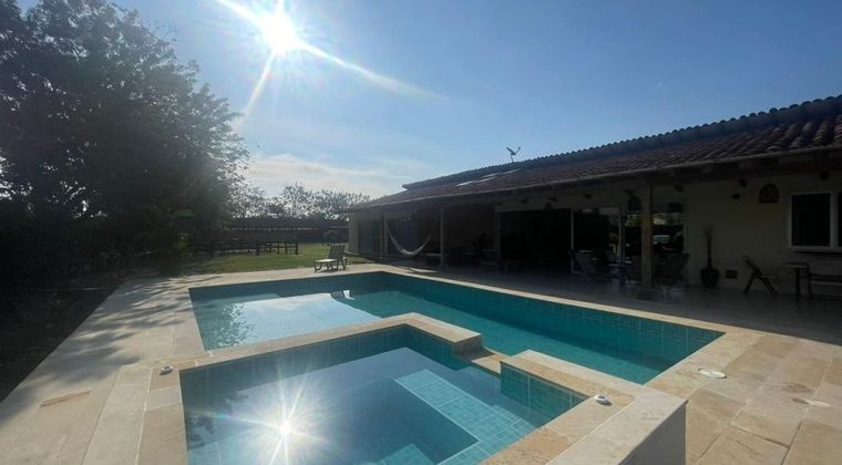 Código. ocho cuatro nueve siete cuatro cinco dos . Venta casa finca campestre en codominio campestre en Rozo Valle del cauca. Distribudia la casa principal en 4 alcobas, 4 baños, sala de tv, sala-comedor, cocina, área de ropas, cuarto del servicio con baño, terraza de ingreso y terraza social. Piscina y jacuzzi con planta de purificación y calentador (gas natural) Todos los servicios incluido el gas natural domiciliario Ingreso por puerta electrica (dos gatos y control remoto) 12 pesebreras estación de baño y brete para exámenes generales, pérgola de aprox. 20 metros cuadrados y apartamento para el trabajador, que consta de 2 alcobas, baño y cocina. Un año de uso