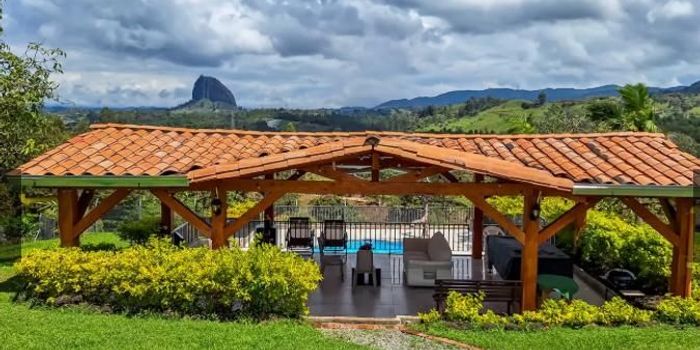 Municipio del Peñol Area total 24.800mts2 con carretera a la casa Área Construida 300mt2 Casa principal 4 alcobas, dos con baño interno,2 con baño compartido 3 habitaciones con closer Sala, comedor y una cocina sencilla , con pipeta de gas Lavadero y zona de ropas Cuarto util Zona húmeda Kiosco grande en madera zona BBQ Mesa de billar Sala Piscina y juegos infantiles La finca está a 2 Kilómetros de la via principal Tiene agua del acueducto veredal y Luz de E P M Cuenta con dos potreros Zona agrícola, con aguacates, yuca , plátanos y frutales.además cuenta con una pequeña quebrada propia Esta finca cuenta con una hermosa vista hacía la Piedra del Peñol , es un lugar muy bonito y turística Recibo apartamento , casa, o casa finca de menor valor. Zona Sur de Medellin