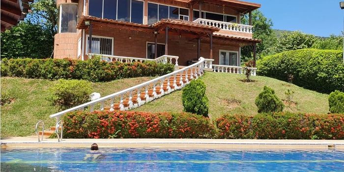 VENDO FINCA EN SAN JERONIMO Precio: $ 1.100.000.000 Área lote: 2100 m2 Área construida: 200 m2 Pisos: 2 Administración: $ 255.000 Predial: $ 1.844.000 4 habitaciones 3 baños Cocina Integral Vestier Aire acondicionado Balcón Sala Comedor 7 parqueaderos: 2 con techo Cuarto útil Zona de ropas Hermosa finca ubicada en San Jerónimo parcelación Las Palmeras, cuenta con: Tanques de reserva de agua, sistema recolección de aguas lluvias con bomba, 2 acueductos, EPM y riego, 2 trampas de grasa, pozo séptico 4 m2 en material y campos de infiltración, piscina de 11x8 m, Jacuzzi, playa, barra-bar, Kiosko circular de 20 m2, baño, amplios andenes, cancha micro fútbol en grama natural, árboles frutales y jardines, portada madera e hierro forjado, rieles desde portería parcelación y portada finca. Venta a puerta cerrada