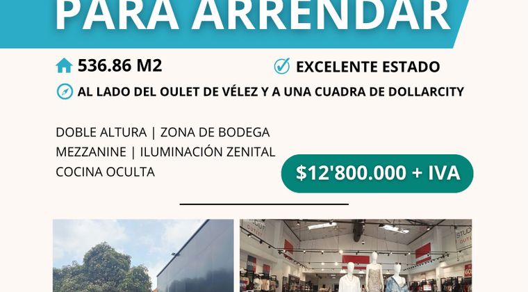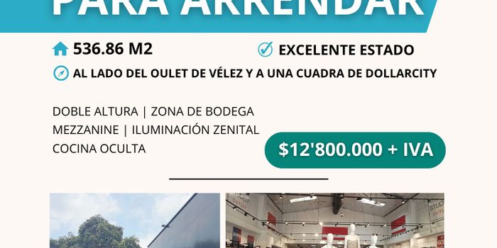 Local sobre la Carrera Primera, al lado del Oulet de Vélez y a una cuadra de Dollarcity. El valor no incluye IVA. Muy buen estado.