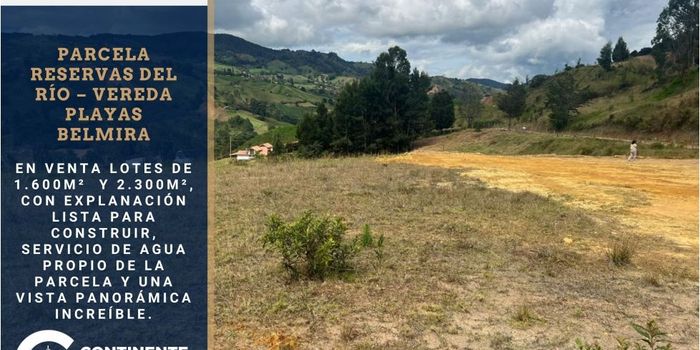 ?✨ Venta de Lotes en Parcelación Reservas del Río – Belmira ? Vereda Playas, Belmira – Excelente ubicación ? Disponibles: Lote 40: 1.600 m² | ? $140.000.000 Lote 41: 2.300 m² | ? $170.000.000 ✅ Terreno plano y firme ✅ Cercamiento con estacones ✅ Agua proveniente de nacimiento propio del proyecto ✅ Rodeados de naturaleza y tranquilidad ? Ubicación estratégica: cerca al Parque Recreativo Plaza del Río, Capilla de Playas, tiendas y a la vía principal San Pedro – Belmira. ? ¡No dejes pasar esta oportunidad de inversión y construye el hogar de tus sueños en un entorno natural y exclusivo! Tú lo sueñas, nosotros lo encontramos.