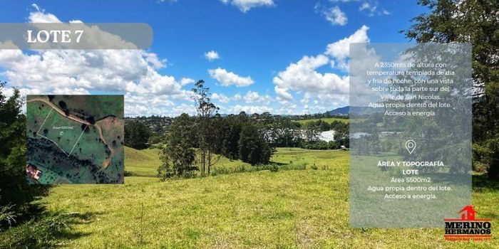Se venden exclusivos lotes campestres ubicados a aproximadamente 2350 – 2400 metros de altura, con clima templado durante el día y frío en la noche. Los lotes cuentan con una hermosa vista panorámica hacia el Valle de San Nicolás, rodeados de naturaleza y tranquilidad.Características generales:• Acceso a energía eléctrica• Disponibilidad o derecho a acueducto• Agua natural propia dentro del lote• Entorno natural y excelente vista panorámica• Ideal para vivienda campestre o proyecto de descansoÁreas disponibles: • Lote 7: 5.500 m²Ubicados en una zona privilegiada del Oriente Antioqueño, con fácil acceso y cerca de municipios del Valle de San Nicolás.