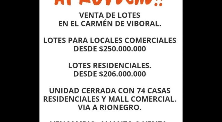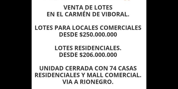 Venta de lotes comerciales y residenciales en el carmen del viboral Via rionegro - carmen del viboral Variedad de lotes, con gran proyeccion, lotes de distinta area, con senderos ecologicos, zona bbq, salon multiple, juego para niños, porteria 24h, zonas de mascotas, huerta Casa unifamiliares, y Bifamiliares con parqueaderos privados
