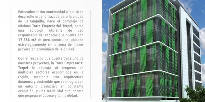 Torre Empresarial Terpel cuenta con 17,386 de área construida, ubicado estratégicamente en la zona de mayor proyección económica de la ciudad, rodeada de colectivo industrial , la torre empresarial se traduce en un importante punto de conexión con compañías internacionales de transporte y servicio , parques comerciales e industriales.nnlobby de doble altura, área de uso comercial , mirador, platas eléctricas de cubrimiento total, doble acceso de estacionamiento, salón de convenciones, 8 niveles de oficinas , 1 nivel de locales comerciales , 3 niveles de estacionamiento , 187 cupos de parqueadero , cuenta con una terraza de hermosa vista al rio para todos los visitantes.